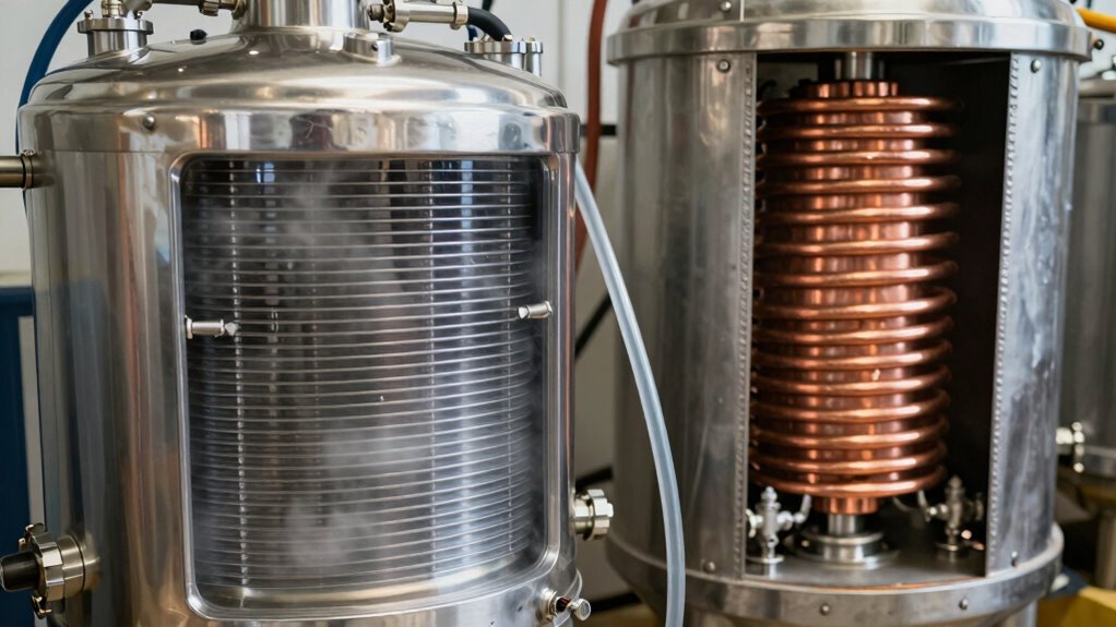 Choosing between plate and counterflow chillers involves considering not just maintenance but also how they fit into your space and budget. Plate chillers are compact, saving valuable brewery space, and generally less expensive initially. However, their aesthetic appeal may be limited due to smaller size and simpler design. Counterflow chillers tend to be bulkier, requiring more room, and often involve higher material durability costs, especially with stainless steel construction. They can be more expensive upfront but are often more durable long-term. The table below highlights key differences: