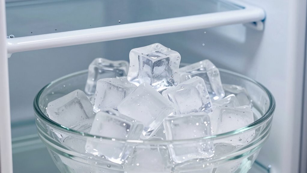 Persistent ice taste problems often stem from lingering odors or contaminated water sources in your freezer or ice maker. To troubleshoot, start by checking your ice storage area for any strong odors and clean it thoroughly. Guarantee your water supply is clean and free of impurities, as contaminated water can negatively affect flavor enhancement. Regularly replace the water filter to prevent stale-tasting ice. Also, inspect your ice maker for mold or buildup that can transfer unwanted flavors. Consider using an odor absorber, like activated charcoal, near the ice storage area. Proper cleaning and maintenance are key to eliminating persistent ice taste issues. By addressing these potential sources, you can enjoy fresh-tasting ice and improve your overall ice experience.