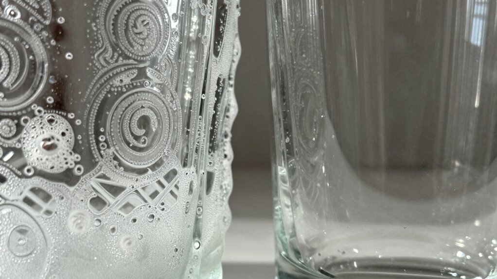 You’ll notice foam behaves differently on etched versus smooth glass because the surface texture influences how light interacts with the material. On etched glass, the frosted, textured surface scatters light evenly, creating a soft glow and reducing glare, which affects how foam adheres or appears. Smooth glass, being polished and flat, transmits light clearly, making foam more visible and defined. Exploring these differences further reveals how surface textures shape both functionality and visual impact, offering insights worth discovering.
