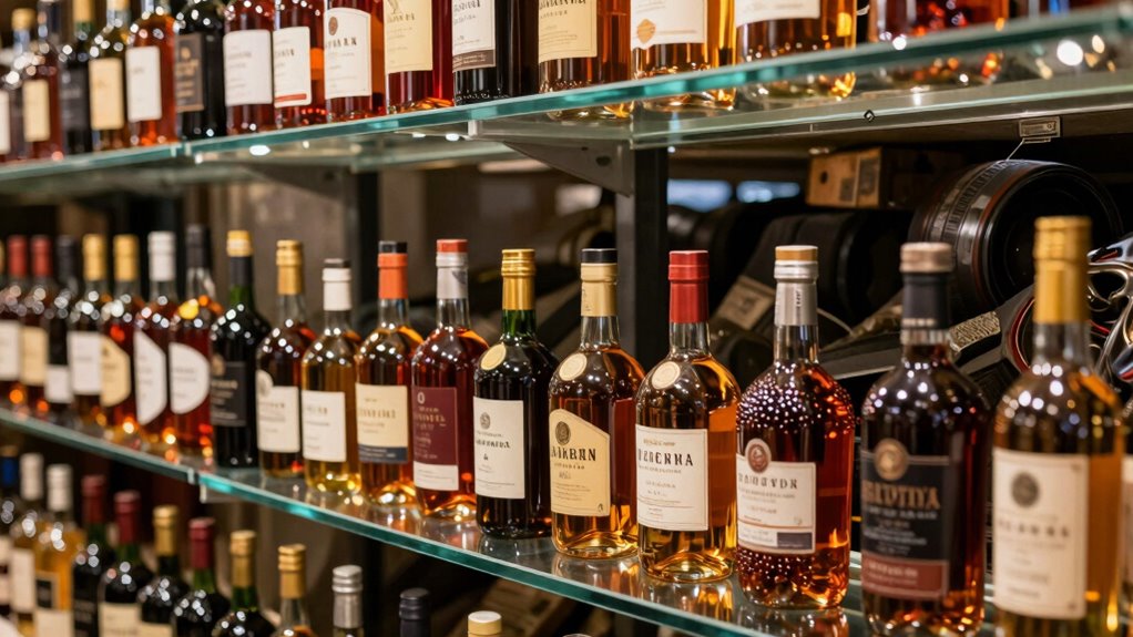 When it comes to managing your liquor collection, understanding the difference between display and storage is essential. If you want your bottles to look appealing while still maintaining their quality, how you arrange them matters. Glass shelf placement plays a critical role here. When you position your bottles on open shelves at eye level, you create an inviting display that showcases your collection’s diversity and character. But be mindful of how you arrange bottles—grouping similar types or brands can make your display more attractive and easier to browse. The clarity of glass shelves allows light to pass through, highlighting the bottles and drawing attention to their labels and colors. However, this setup isn’t just about aesthetics; it’s also about the ambient lighting effects. Proper lighting can turn your liquor display into a focal point, emphasizing the richness of the bottles and creating an inviting atmosphere. Soft, warm lights can enhance the amber hues of whiskey or the deep reds of wine, making your collection look more vibrant. But be cautious—exposure to direct sunlight or harsh lighting can damage your bottles over time, causing labels to fade and liquids to degrade. Using indirect or adjustable lighting helps you strike the right balance, illuminating your collection without exposing it to harmful rays.