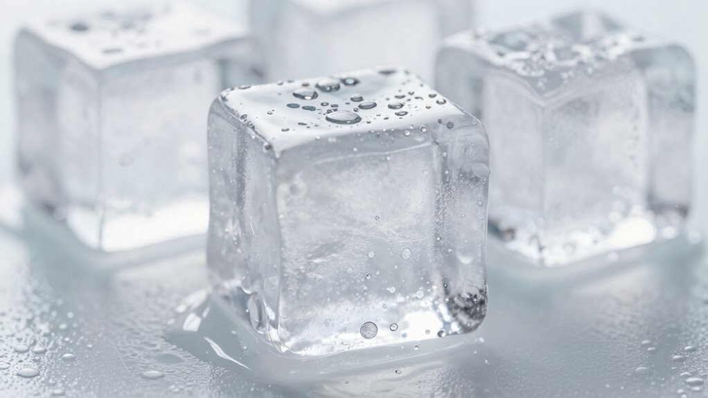 Have you ever noticed that your ice sometimes turns cloudy and develops an off-taste? This happens because of ice melting and crystal formation inside the block. When water freezes slowly or unevenly, it creates larger crystal structures, which trap air and impurities. These trapped air bubbles reflect light, making the ice appear cloudy. Additionally, impurities like minerals or dissolved solids can get trapped during freezing, contributing to off-flavors. As the ice melts, these impurities are released into your drink, altering its taste. Crystal formation and uneven freezing are key reasons why ice loses its clarity and freshness. To keep your ice clear and tasting fresh, it’s essential to use purified water and freeze it evenly. Engaging in mind-body healing practices can also enhance your overall enjoyment of beverages, as a calm state of mind can make even simple pleasures feel more rewarding. Furthermore, studies suggest a correlation between astrological signs and perceived beauty, which can elevate your overall experience while enjoying drinks. Moreover, understanding slang terms in food preparation can also contribute to better results in your culinary experiences. Additionally, using high refresh rates in your home entertainment setup can improve the overall enjoyment of your beverages when paired with engaging visuals.