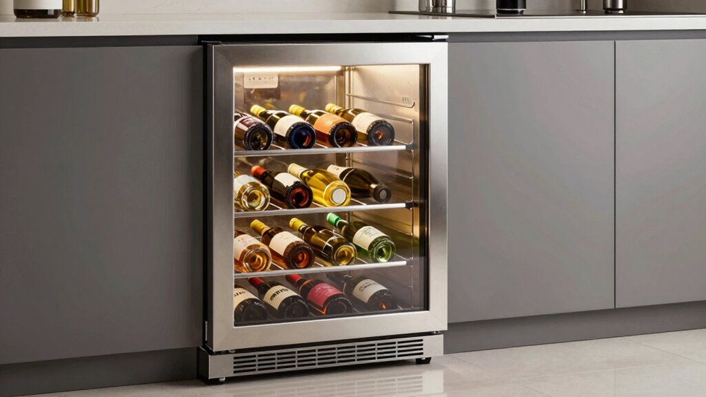 Lighting options play an essential role in enhancing the visual appeal and functionality of a 15-inch undercounter wine cooler, especially since these units are often showcased in prominent kitchen or bar areas. LED lighting is popular because it can be customized with different colors like amber, blue, or white, creating various moods while highlighting your wine collection. Soft interior lighting mimics a traditional wine cellar, providing gentle illumination that doesn’t affect the wine’s quality. Adjustable settings let you turn the lights on or off or choose specific colors to match your decor. Proper placement and brightness are key to avoiding UV exposure, which can damage wine over time. Plus, long-lasting LED lights don’t generate heat, helping maintain a stable internal temperature.