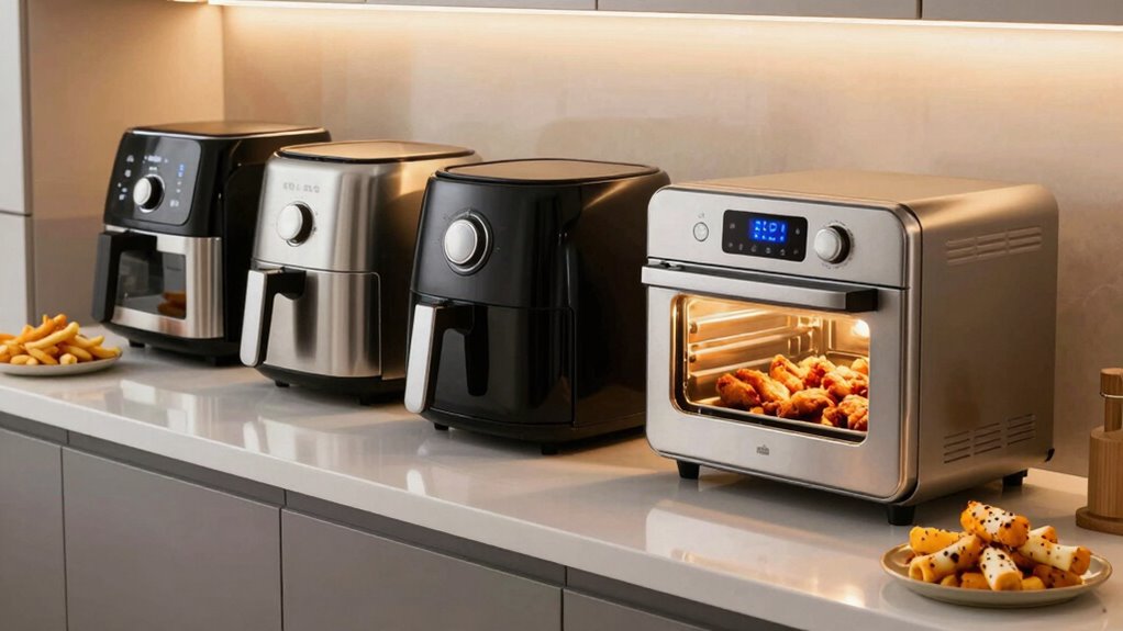 Are customizable temperature controls important for your snack cravings? Absolutely! Many models now offer precise, adjustable temperature settings tailored for different foods. I’ve found that appliances like the Ninja Foodi or Cosori Air Fryer Oven provide excellent control, letting you set the perfect heat for crispy wings or delicate mozzarella sticks. This feature guarantees your snacks come out just right every time, making your party prep easier and more foolproof.