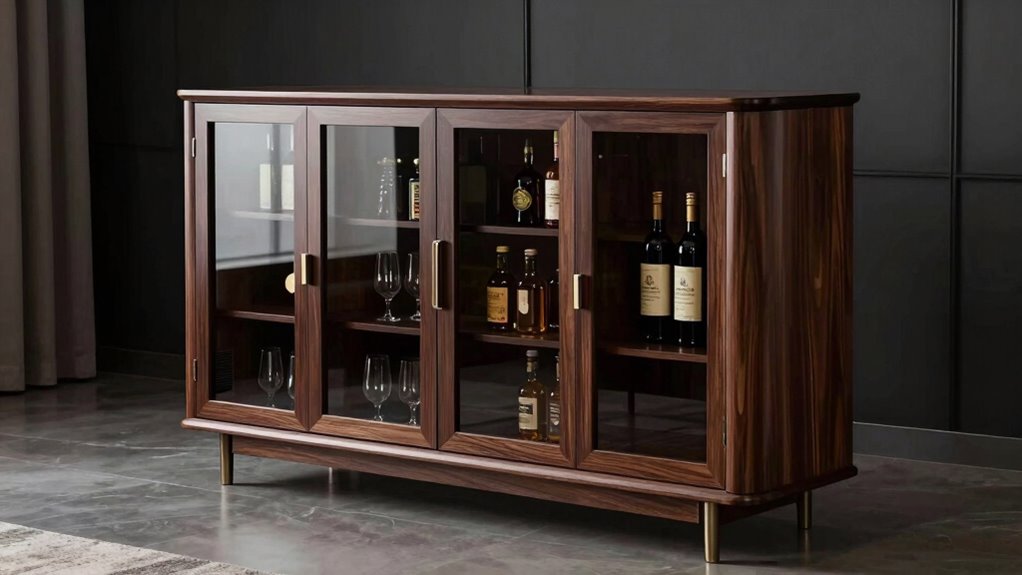 Choosing a bar cabinet with refrigerator space means paying close attention to the materials used, as durability directly impacts its longevity. High-quality materials like engineered wood, MDF, or solid wood offer better resistance to scratches, dents, and moisture, ensuring the cabinet stays looking great over time. These materials also provide stronger structural integrity, making the unit more resilient to daily wear and tear, especially in busy areas. Many durable options come with finishes or coatings that boost resistance to water, stains, and fading, which is essential for maintaining its appearance. Ultimately, the quality of the construction materials directly influences how long your cabinet will last, making material durability a key factor in your selection process.