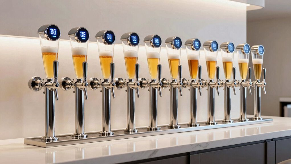 Ever wondered how some beer dispensers keep the tap perfectly cold for hours? It’s all about the cooling features. Effective systems maintain ideal temperatures between 38-45°F (3-7°C), preserving freshness and carbonation. Built-in insulation, like double-walled stainless steel or insulated jackets, helps keep beer cold for hours without needing external refrigeration. Some dispensers even include integrated cooling systems or cooling packs that actively lower and sustain the temperature, guaranteeing consistent coldness during long periods of use. Proper insulation and cooling mechanisms prevent temperature fluctuations, which can ruin beer flavor, aroma, and foam stability. Maintaining a steady temperature is essential for preserving the beer’s effervescence and avoiding spoilage or off-flavors caused by warmth. Reliable cooling features ensure your beer stays fresh and perfect from the first pour to the last.