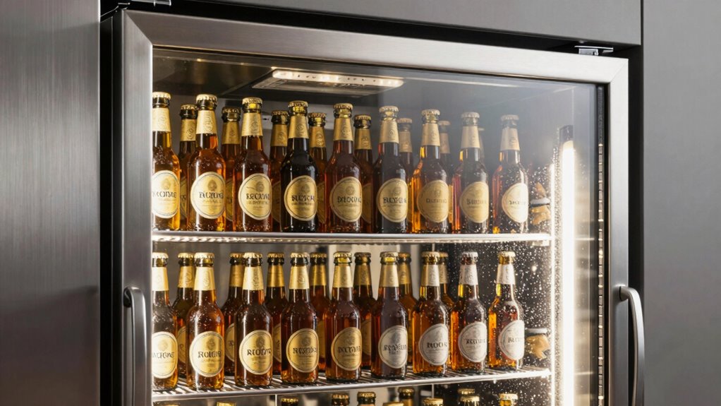 Beyond placement, the additional features of a beer fridge can notably enhance its convenience and usability. Reversible doors and adjustable shelves allow me to customize the interior layout to fit bottles of various sizes and my space needs. Interior lighting makes it easy to find drinks quickly, especially in dim settings. Built-in bottle openers and can dispensers add a layer of convenience during parties or gatherings, saving me trips to the kitchen. Energy-efficient designs help lower operating costs, which is a smart long-term choice. Low noise levels, typically under 42dB, ensure the fridge runs quietly in my home or office. Features like UV-resistant doors and digital temperature controls help preserve beverages at the perfect temperature, keeping my drinks fresh and ready to serve.