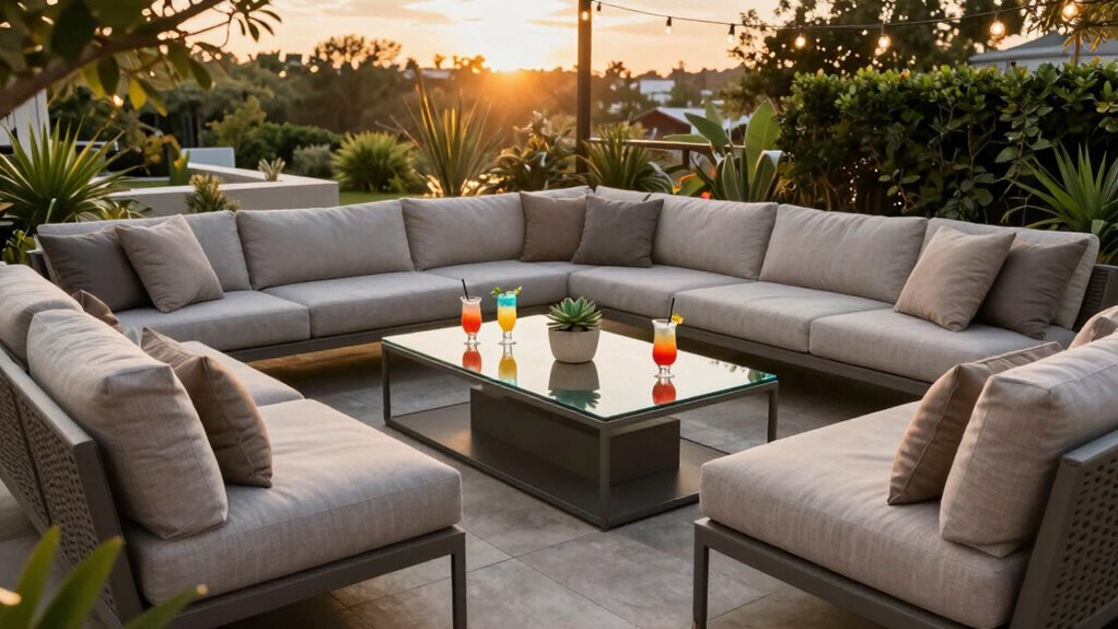 Choosing an outdoor sectional with a bar table means paying close attention to the materials used, as they directly impact durability and longevity. High-quality materials like weather-resistant rattan, high-grade polyethylene, and powder-coated steel are essential. UV-resistant PVC rattan and powder-coated steel frames resist sun damage, rust, and corrosion, ensuring the furniture stays looking new longer. Materials that are water-repellent and mold-resistant protect against rain and humidity, maintaining structural integrity over time. For bar tables, solid hardwoods like acacia or teak offer natural resistance to decay and insect damage. Selecting furniture made from these weatherproof, durable materials guarantees your outdoor setup remains functional and attractive, even after years of exposure to the elements.