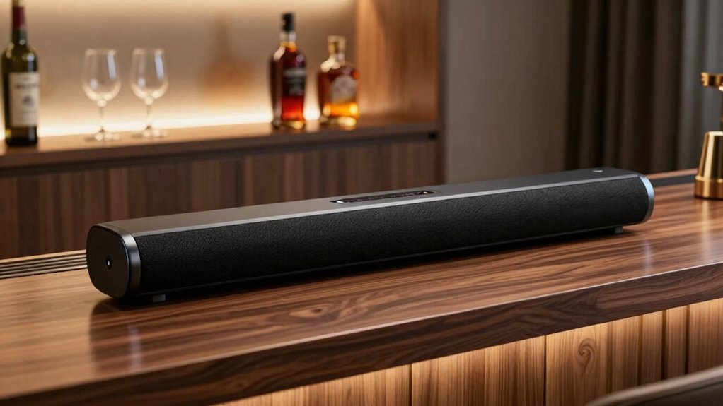 Selecting a soundbar that fits your home bar setup requires paying close attention to its design and space requirements. You want a model that complements your room’s size and aesthetic, whether that’s sleek and minimalistic or more substantial. Consider whether the soundbar is designed for tabletop placement, wall-mounting, or both—this flexibility guarantees it fits your setup perfectly. Slim, low-profile models are excellent for tight spaces or minimalistic designs, especially where clearance above or below the TV is limited. Also, check the overall dimensions and weight to ensure easy installation and stability, particularly if wall-mounted. Finally, make sure the included mounting hardware or stands suit your preferred location, so everything fits securely without obstructing views or other equipment.