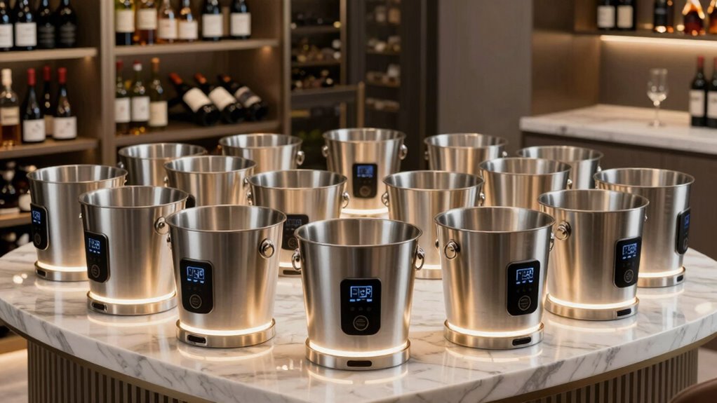 Choosing the right cooling technology for an electric wine cooler bucket is essential because it directly impacts how well your wine stays at the perfect temperature. Thermoelectric systems use Peltier elements to transfer heat, offering precise temperature control and minimal vibration—ideal for delicate wines. Vacuum-insulated chillers rely on double-walled stainless steel with vacuum sealing to keep wine cold without needing ice or power, making them low-maintenance and portable. Freeze-wall technology involves materials that turn into a solid ice-like state when frozen, providing long-lasting cooling without melting mess. Each technology has its advantages: thermoelectric units are precise, vacuum-insulated models are low-maintenance, and freeze-wall systems excel in long-lasting cooling. Your choice depends on your specific needs for duration, convenience, and setup.