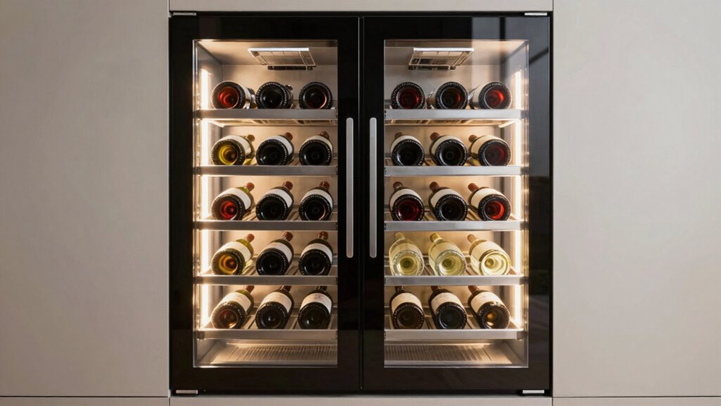 Have you ever noticed how proper lighting can transform the way you view your wine collection? Good lighting, like soft LED or warm interior lights, enhances visibility without harming the wine or labels. UV-resistant glass doors are essential—they protect your bottles from ultraviolet rays that can degrade quality over time. Adjustable lighting settings let you customize the ambiance or suit different environments, making your collection look inviting. Clear, illuminated displays and well-lit shelving improve ease of access and help you quickly find the perfect bottle. Creating a wine cellar-like atmosphere with thoughtful lighting not only highlights your collection but also adds a touch of sophistication to your space. Proper lighting is key to enjoying and showcasing your wine with confidence.